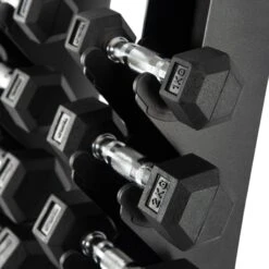 El juego de mancuernas consta de 10 pares de mancuernas hexagonales (1-10 kg) y el soporte correspondiente para guardarlas y mantener en orden la zona de entrenamiento.