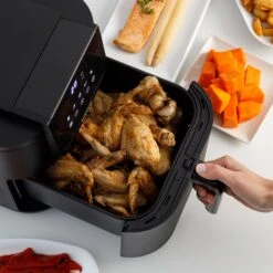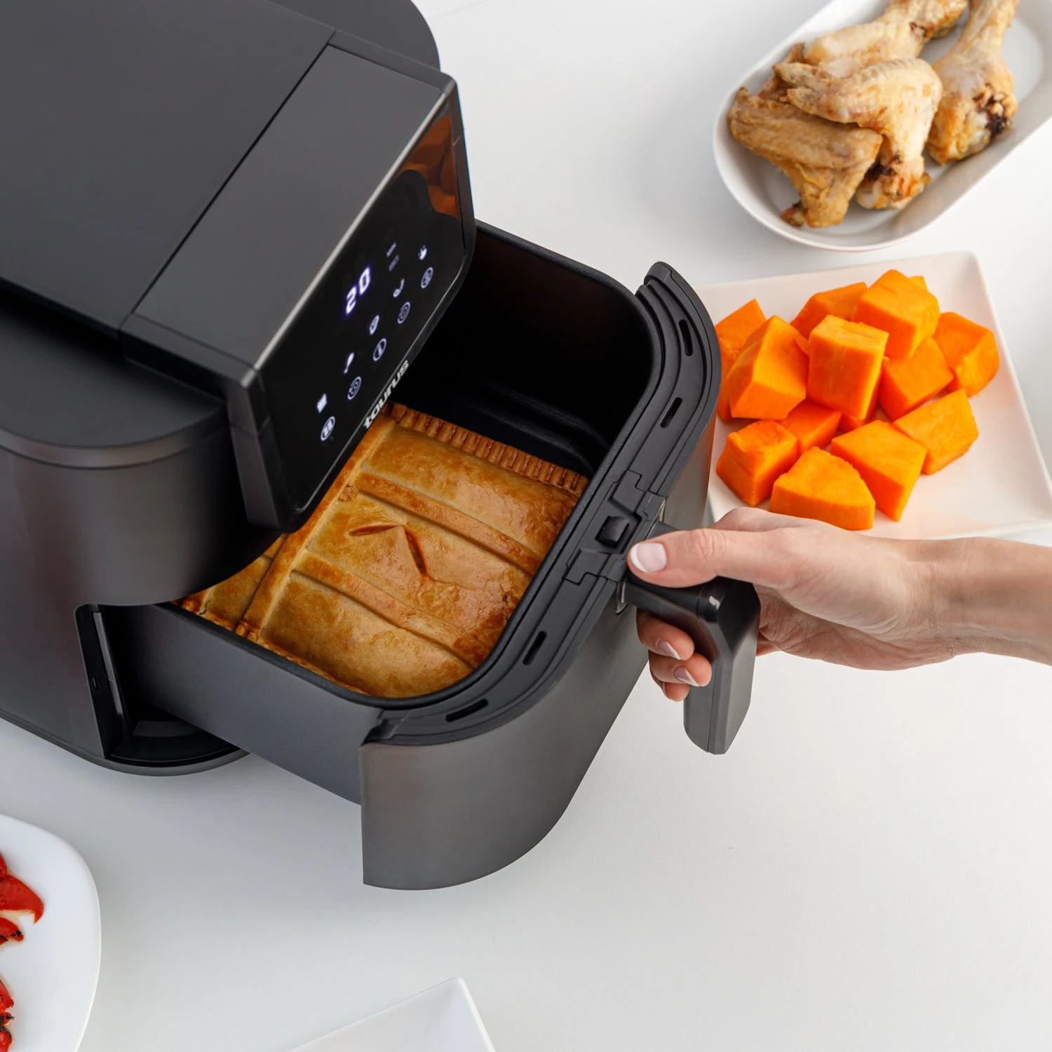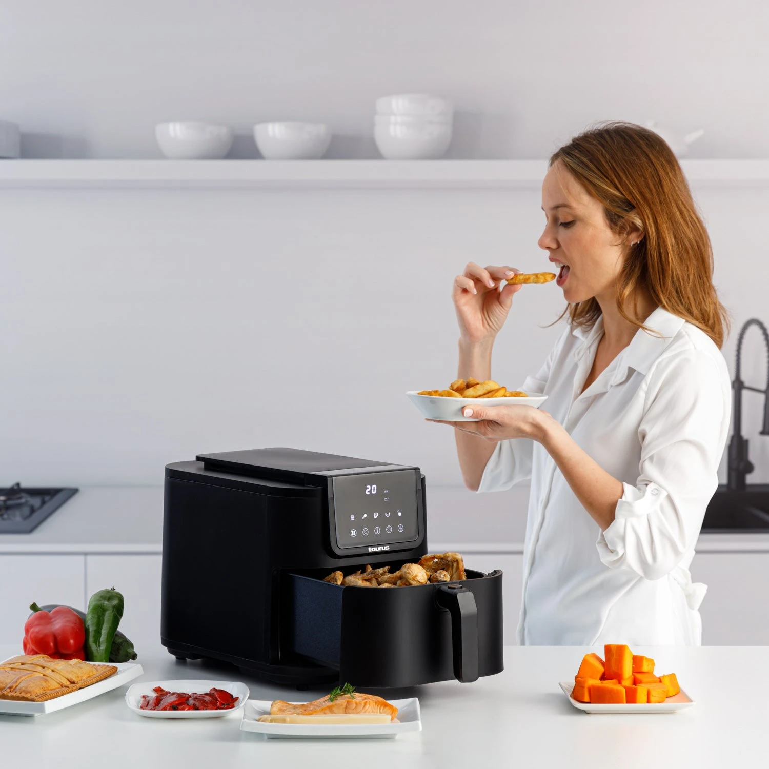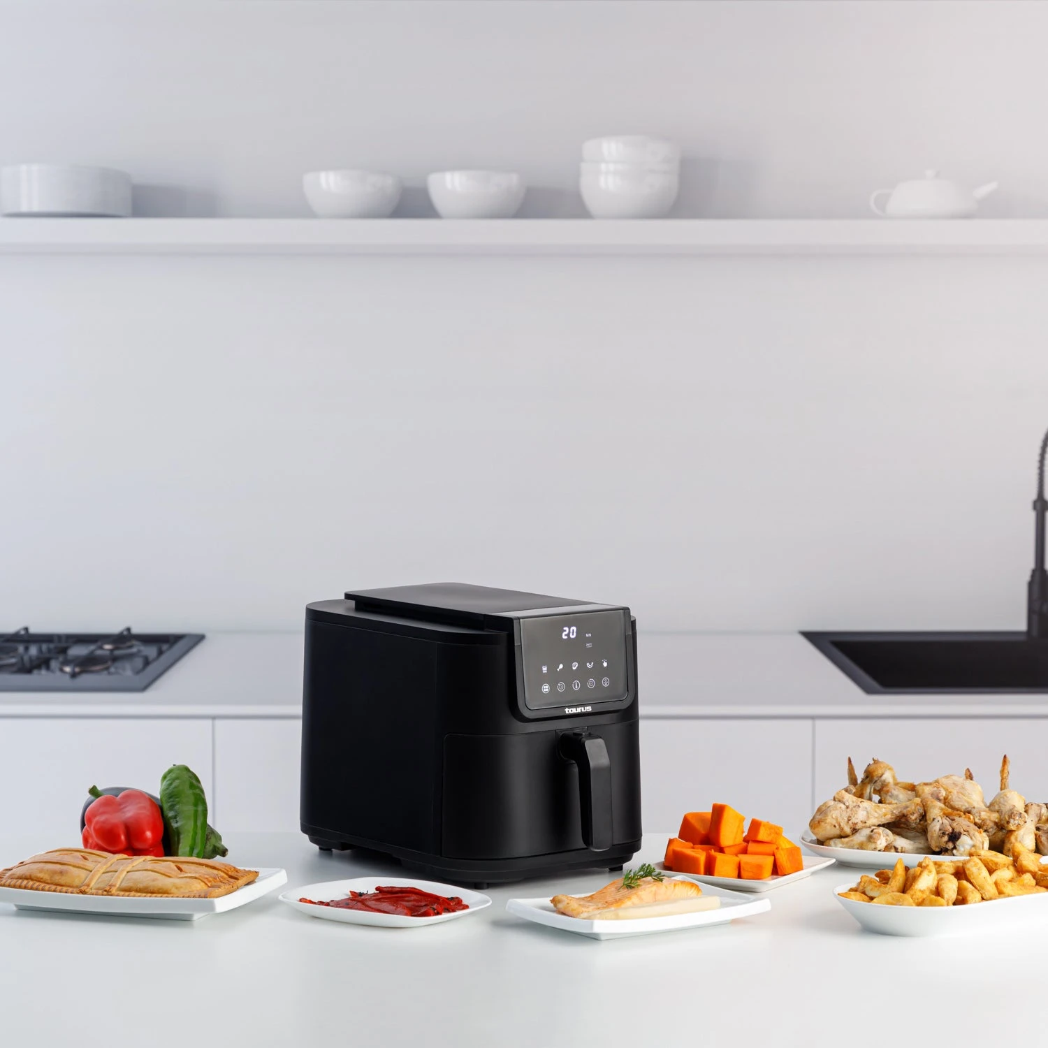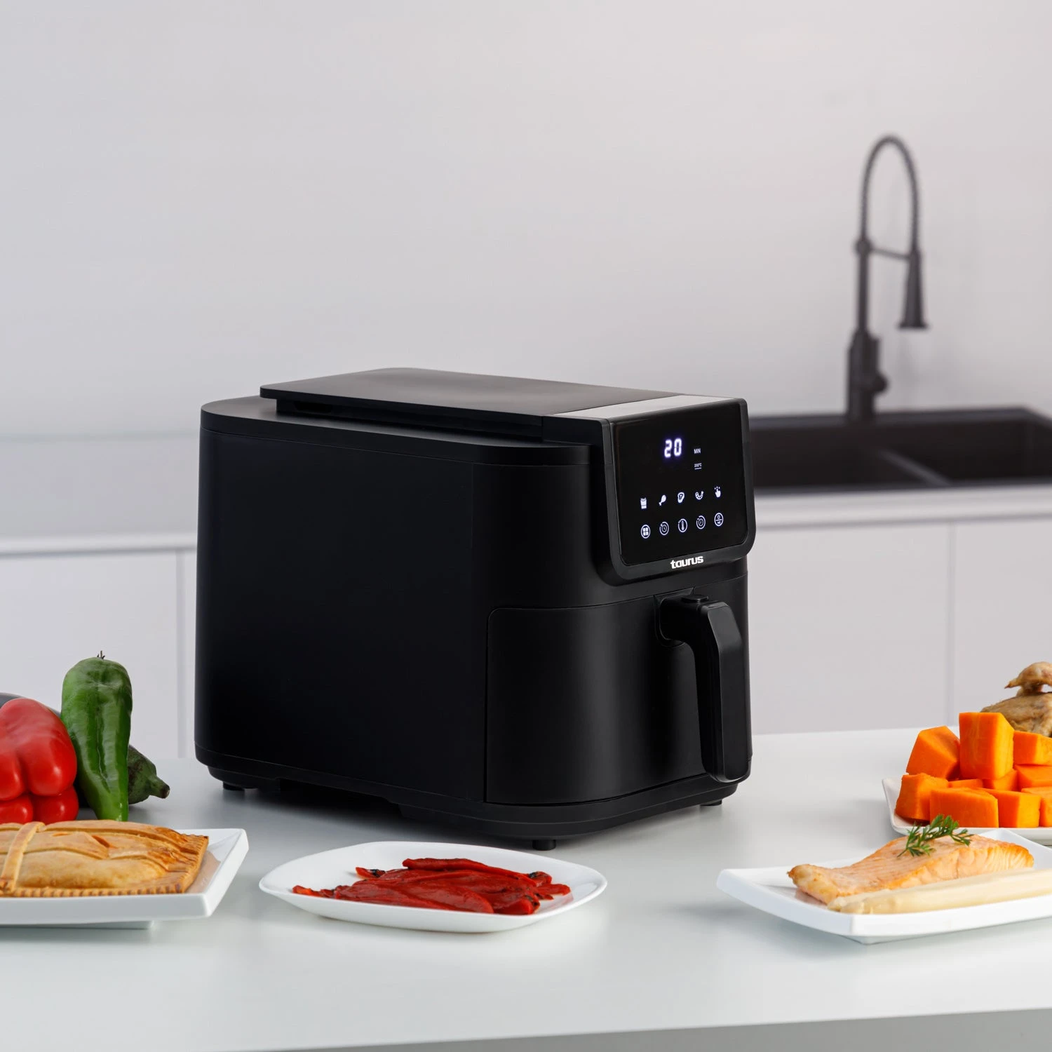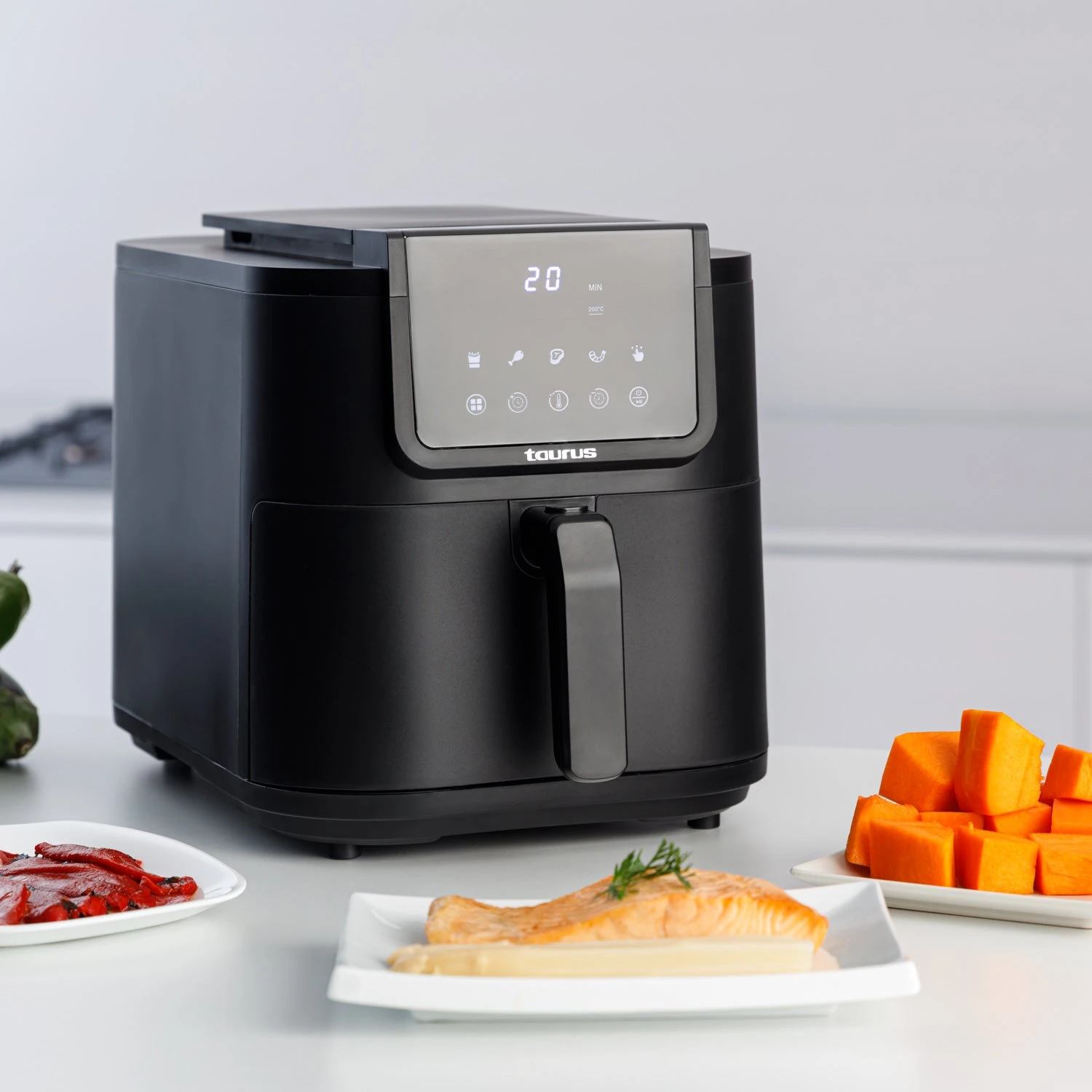 La freidora de aire Taurus Aero Crisp 8L combina gran capacidad con un diseño ultra compacto. Ofrece 5 menús predefinidos, temporizador de 60 minutos, temperatura ajustable (80-200 ºC) y pantalla táctil. Con cestillo antiadherente apto para lavavajillas, es segura, eficiente y perfecta para cocinar sin aceite. Fríe con hasta un 99 % menos de grasa y consigue los mismos resultados que una freidora convencional.