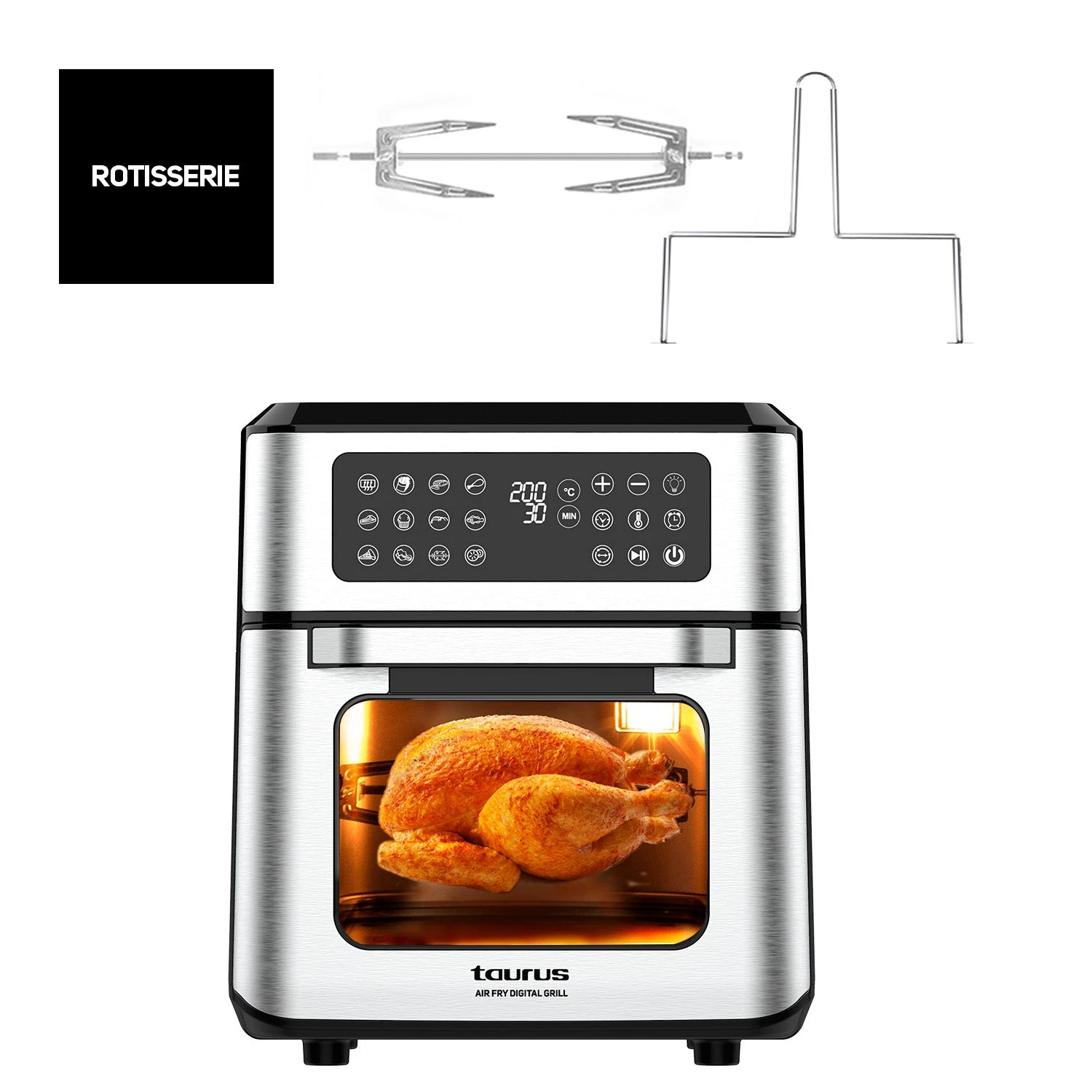 La freidora de aire Air Fry Digital Grill de Taurus combina 1800W de potencia y 12L de capacidad, ideal para familias. Fríe, hornea, deshidrata y más con tecnología Air Technology, cocinando con un 99% menos de grasa. Con 12 programas predefinidos y eje asador de 360°, ofrece resultados rápidos y uniformes. Su diseño compacto, accesorios aptos para lavavajillas y panel táctil la hacen práctica y fácil de usar. Cocina de forma saludable y deliciosa en cualquier ocasión.