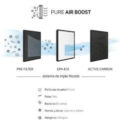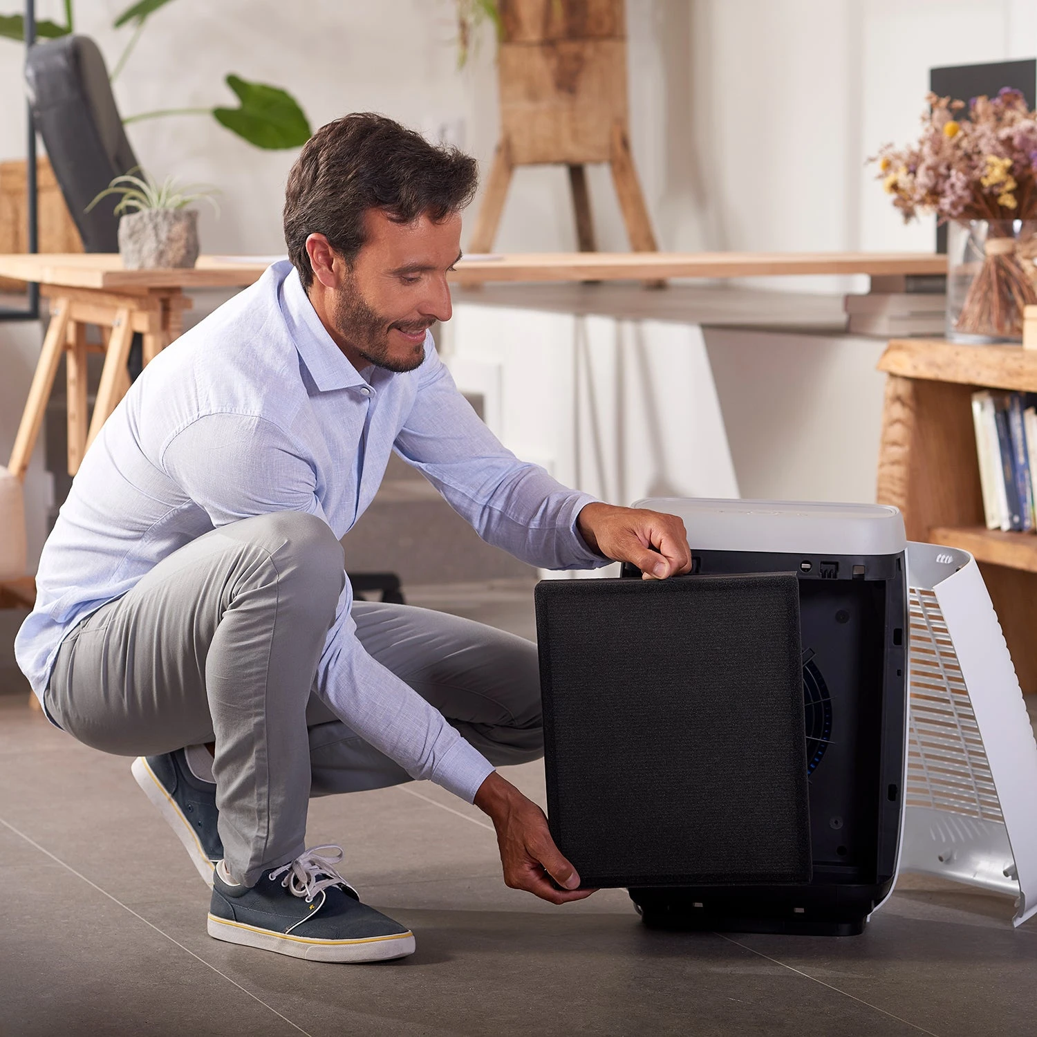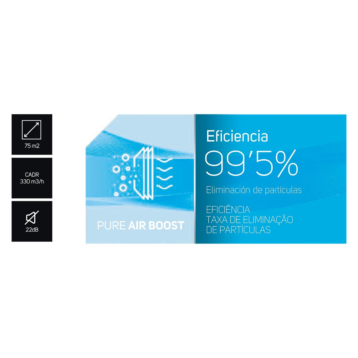Respira aire puro en tu hogar con el purificador de aire AP2040. Elimina el 99.5% de las partículas del aire en superficies de hasta 75 m2, su sistema de filtración triple Pure Air Boost ofrece un elevado índice de eficiencia que garantiza una muy buena tasa de entrega de aire limpio (CADR) de 330m3/h, de los mejores resultados del mercado.