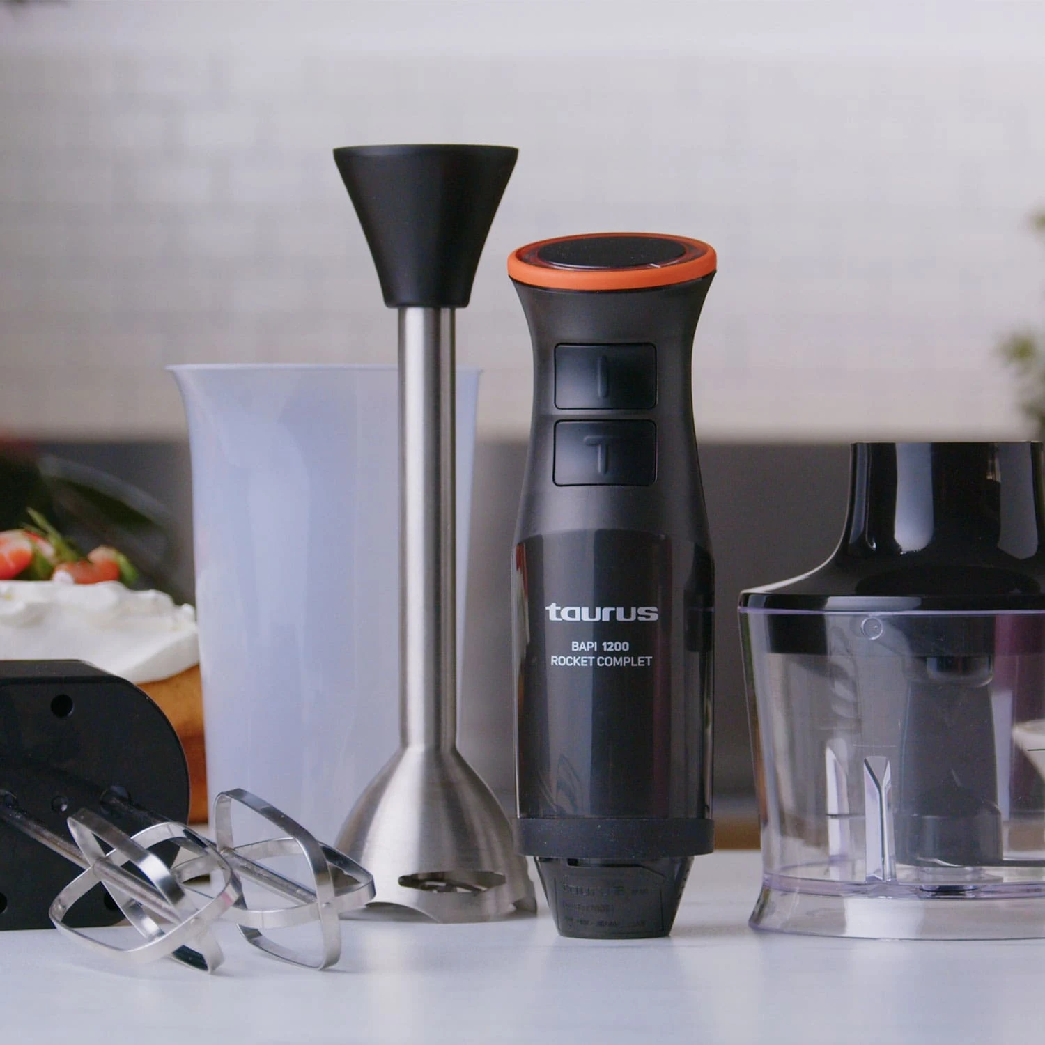 La batidora de mano Bapi 1200 Rocket Complet de Taurus combina 1200W de potencia, 20 velocidades y función Turbo para resultados precisos. Su doble emulsionador es ideal para repostería, permitiendo preparar cremas, merengues y masas perfectas. Con Turbo Rotation System y cuchillas de acero inoxidable, pica hielo y mezcla con facilidad. Incluye vaso medidor, picador y accesorios aptos para lavavajillas, garantizando comodidad y limpieza. Diseñada para recetas versátiles con acabados profesionales en la cocina.
