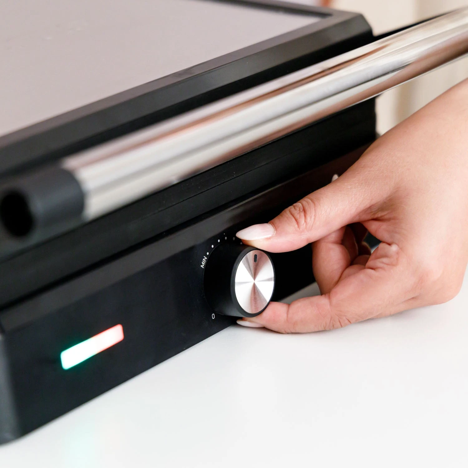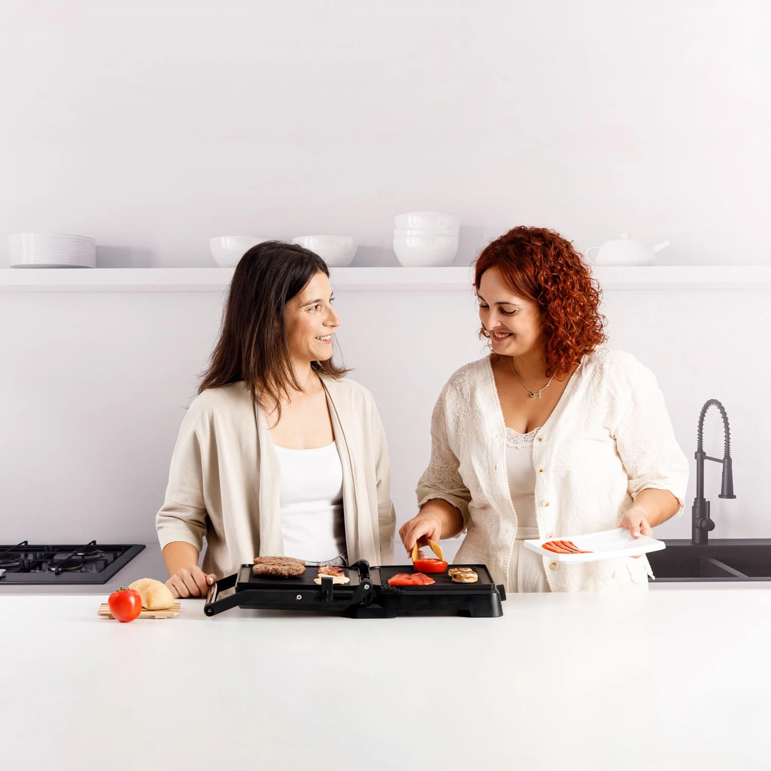 El grill y plancha de asar 2 en 1 Bistro Essential de Taurus combina 2600W de potencia y versatilidad, con placas grandes de 29×23 cm y revestimiento antiadherente libre de PFOA. Con Stair System, ajusta la altura en 5 niveles para adaptarse al grosor de los alimentos. Incluye apertura 180º, termostato regulable y bandeja recoge grasas extraíble. Su diseño práctico con bloqueo de placas y asa de toque frío garantiza seguridad y facilidad de uso. Perfecto para cocinar con precisión y limpieza.