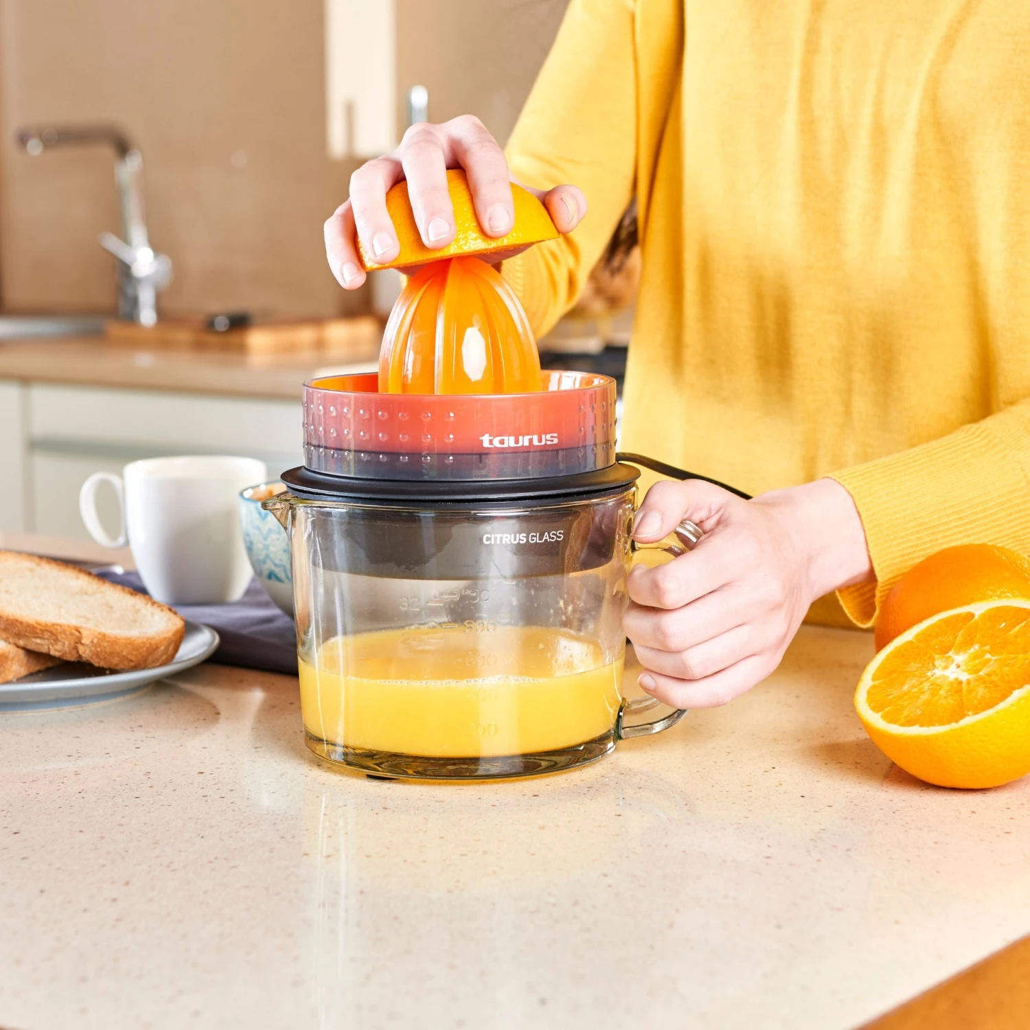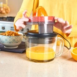 El exprimidor de 30W con jarra de cristal graduada de 1L combina funcionalidad y diseño elegante. Ofrece un regulador de pulpa y rotación doble para extraer al máximo el jugo de cada fruta. Su diseño desmontable y piezas aptas para lavavajillas facilitan la limpieza, mientras que el almacenamiento interno optimiza el espacio. Ideal para preparar y servir zumos frescos directamente en la mesa, es perfecto para quienes buscan practicidad y estilo en su cocina.