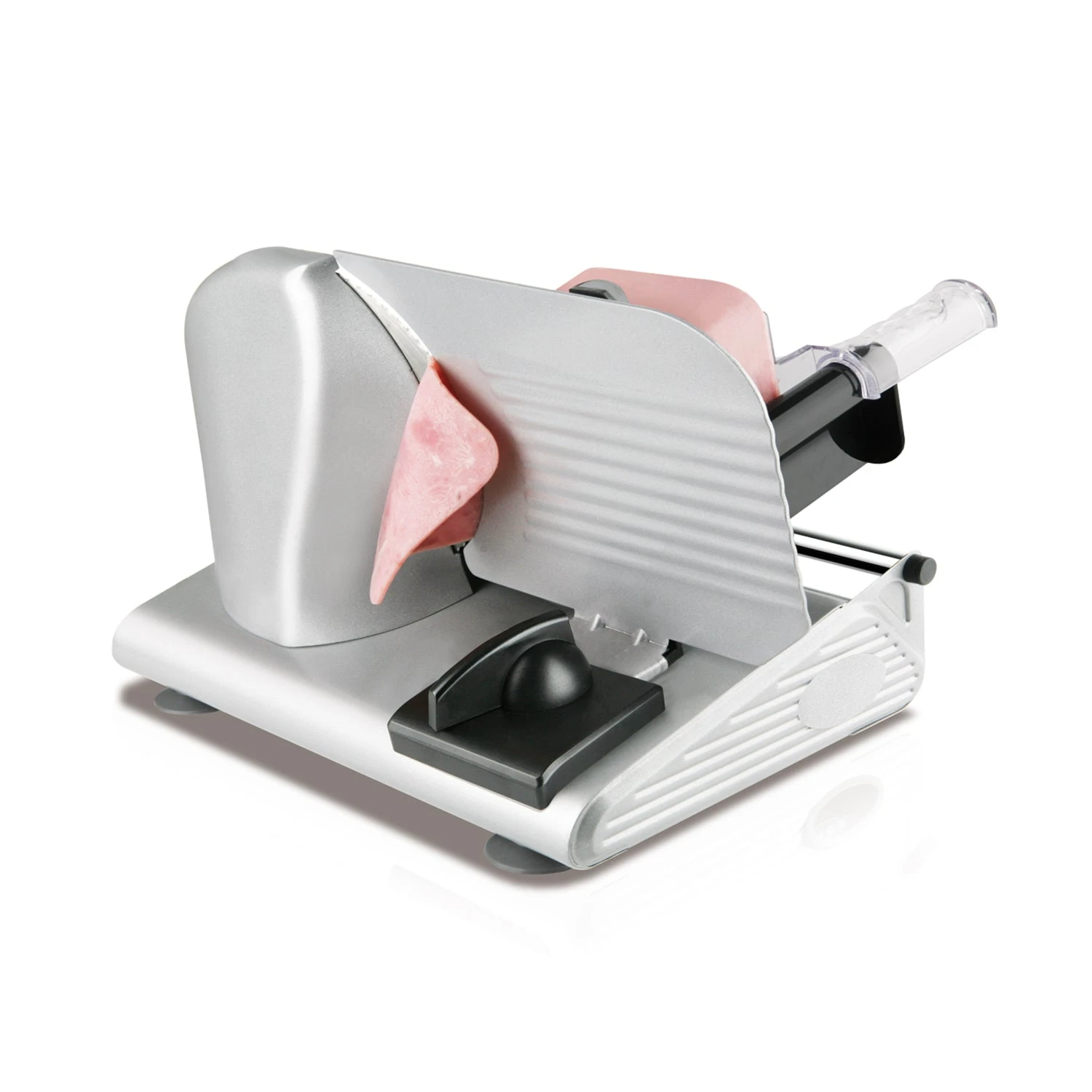 El cortafiambres de 150W con cuchilla de acero inoxidable de 19 cm es ideal para cortar todo tipo de alimentos con grosor ajustable de 1 a 15 mm. Incluye mesa de corte abatible para fácil limpieza, empujador de seguridad y base con ventosas para mayor estabilidad. Su diseño compacto y cuerpo metálico con acabados en acero inoxidable lo hacen duradero y elegante, perfecto para uso doméstico. Ideal para obtener cortes precisos de manera práctica y profesional en tu hogar.