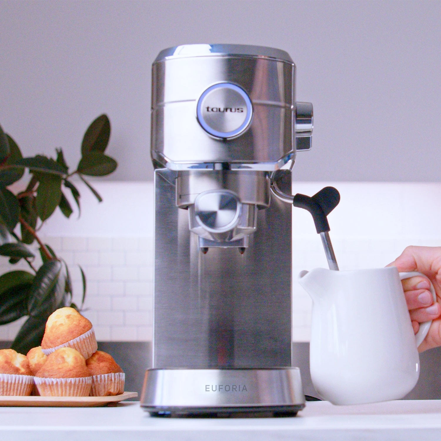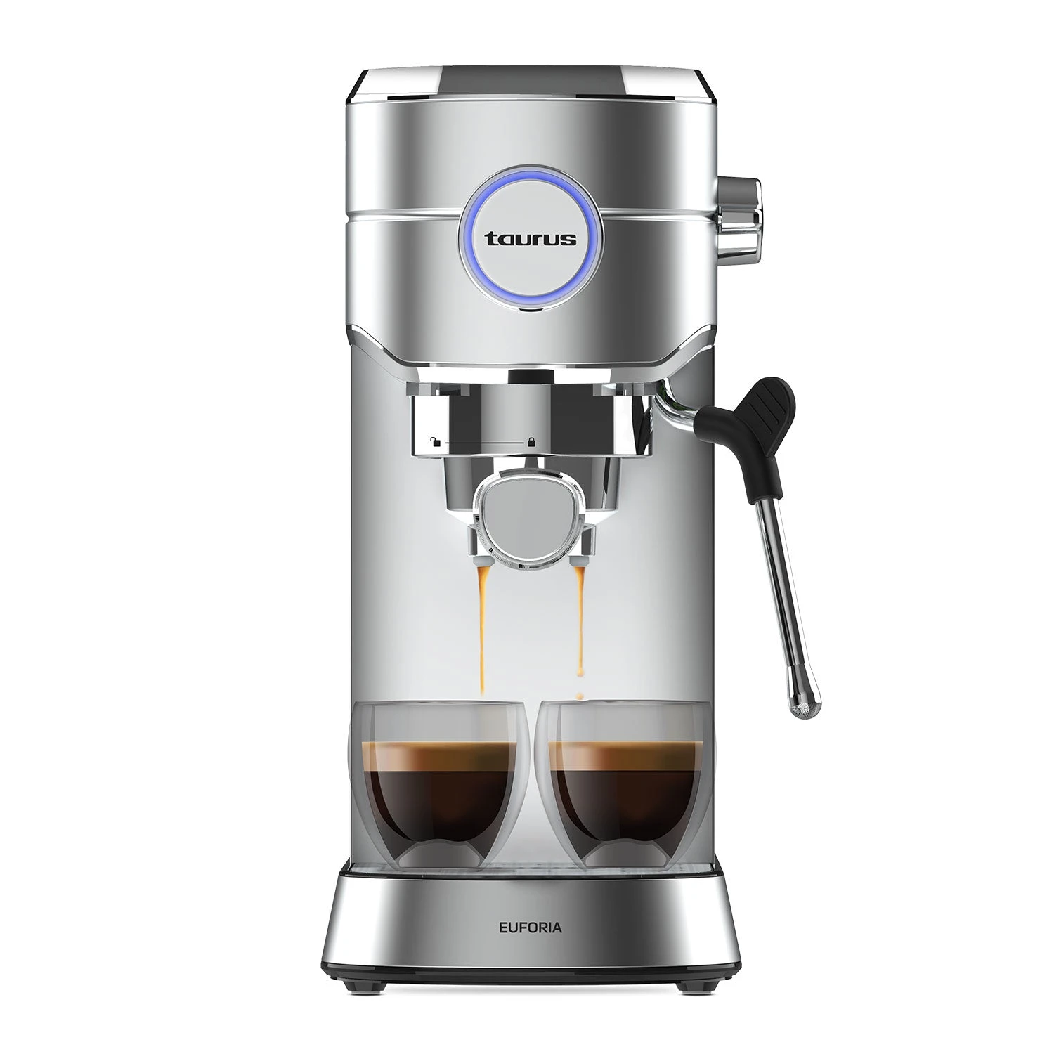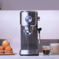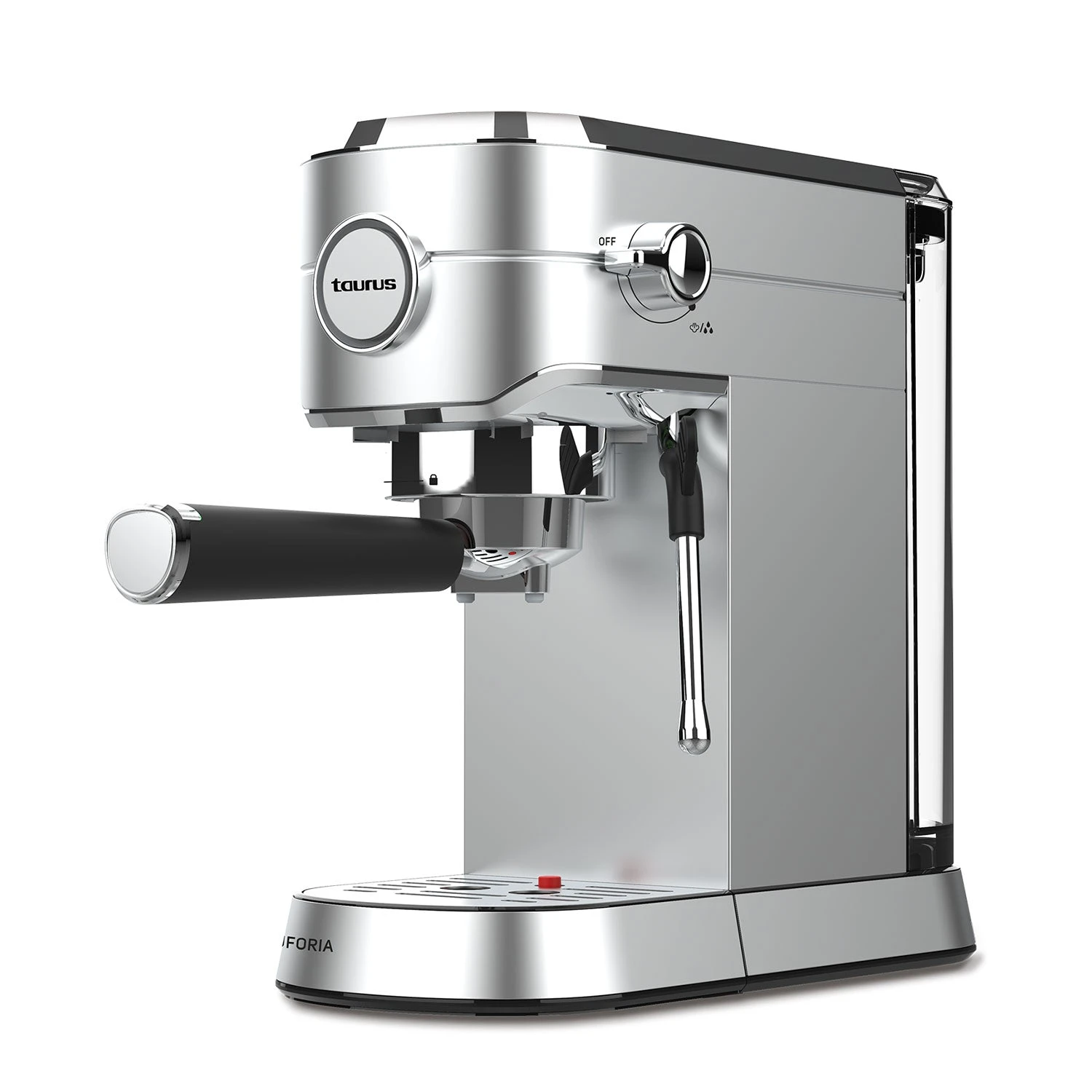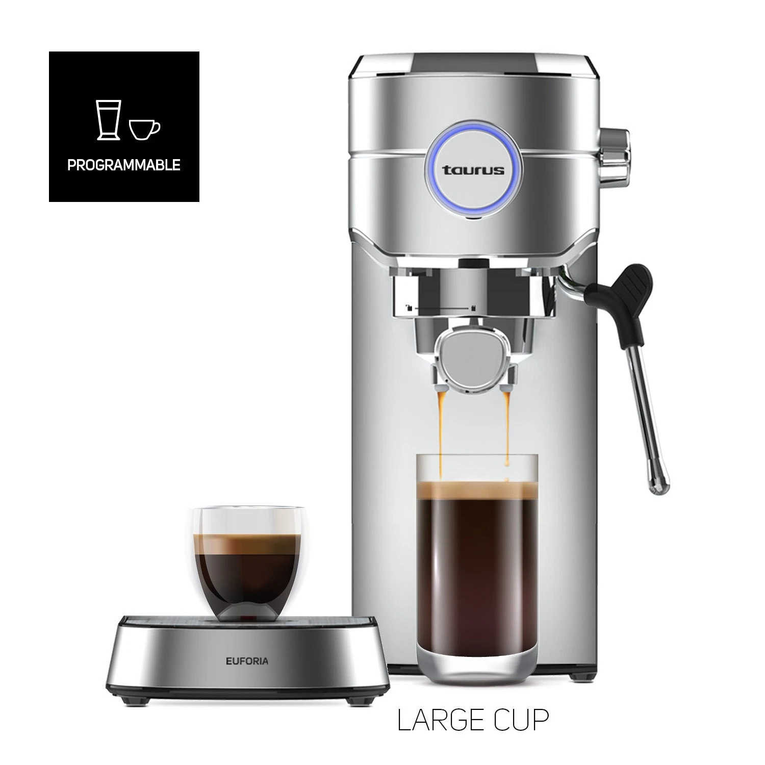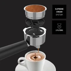 La cafetera espresso Euforia de Taurus combina 20 bares de presión, 1450W de potencia y sistema Thermoblock para un calentamiento rápido y un espresso de calidad profesional. Con Supreme Cream System, garantiza una crema densa y consistente. Dispone de vaporizador, bandeja calienta tazas de acero inoxidable, depósito extraíble de 1L y es compatible con monodosis. Su diseño con acabados en acero inoxidable aporta durabilidad y estilo a cualquier cocina.