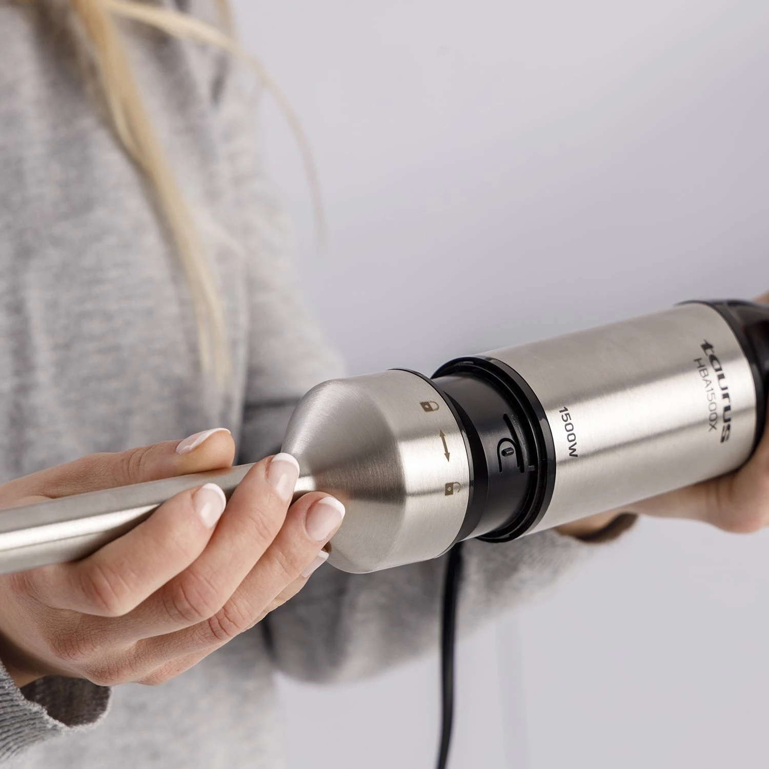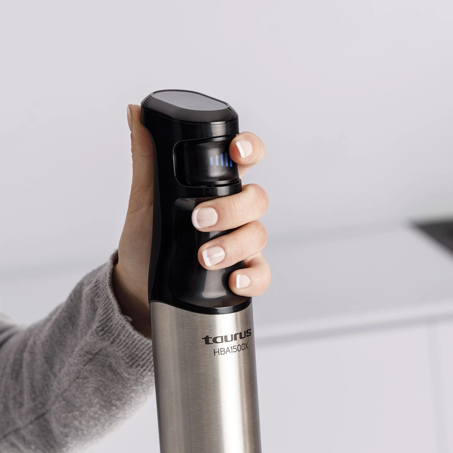La batidora de mano HB1500X de Taurus combina 1500W de potencia con tecnología Stepless para ajustar la velocidad desde el pulsador. Sus cuchillas de acero inoxidable y diseño ergonómico con agarre soft-touch garantizan resultados rápidos y cómodos. La campana antisalpicaduras y la varilla de acero inoxidable ofrecen limpieza y durabilidad. Fabricada con materiales libres de BPA, es apta para lavavajillas, asegurando practicidad y seguridad. Perfecta para preparar batidos, cremas y recetas con resultados profesionales.