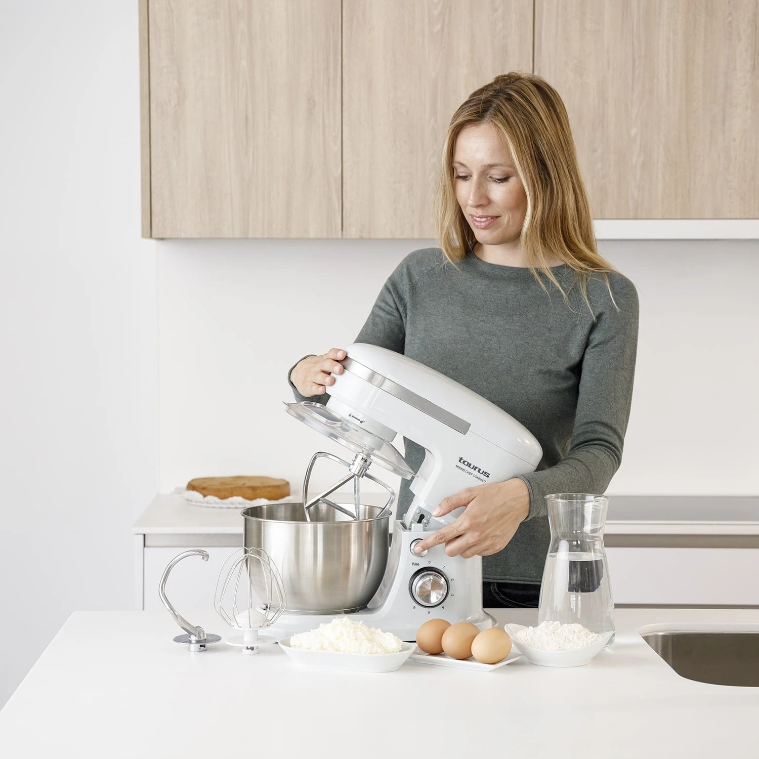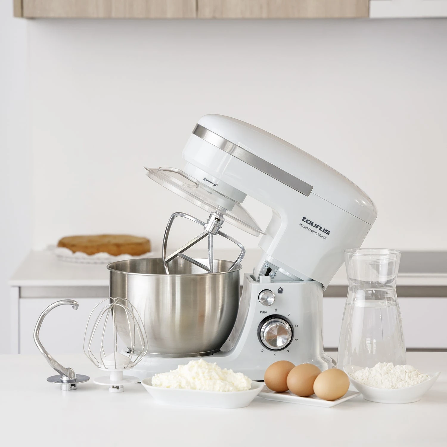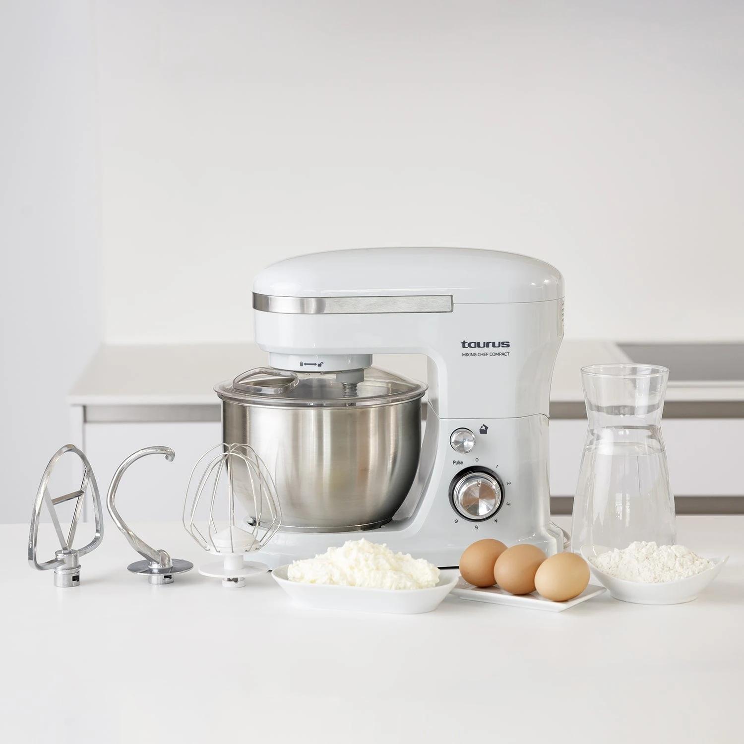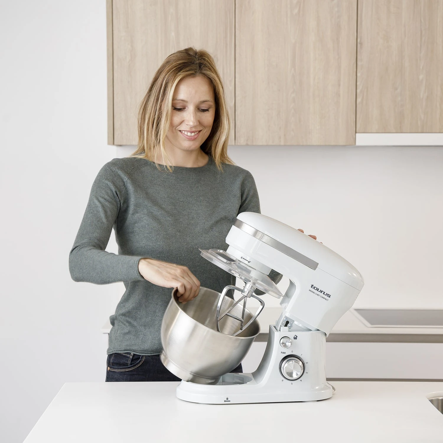 La batidora amasadora Mixing Chef Compact de Taurus combina 1000W de potencia, 6 velocidades y tecnología Planetary System para mezclas homogéneas. Su bol de acero inoxidable de 4L con tapa anti-salpicaduras es ideal para grandes cantidades. Incluye 3 accesorios: gancho batidor, amasador y mezclador, adaptándose a cualquier receta. Diseñada con motor robusto, base antideslizante y fácil limpieza, es perfecta para repostería, masas y preparaciones exigentes. Ofrece resultados profesionales en un diseño compacto y práctico.