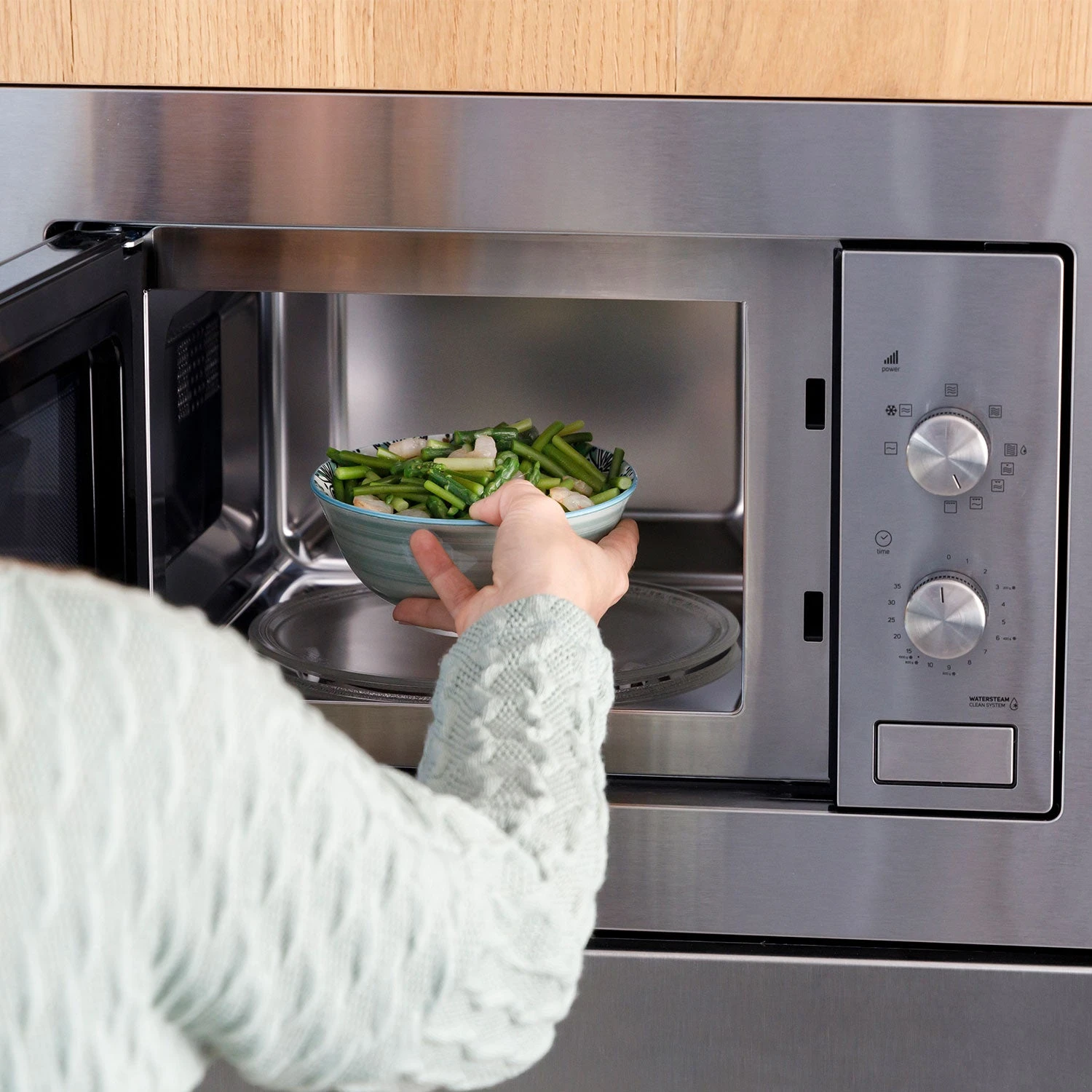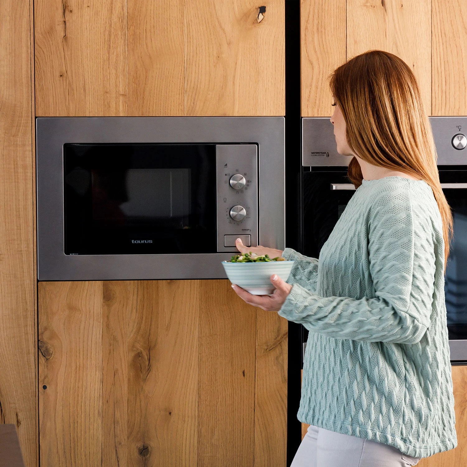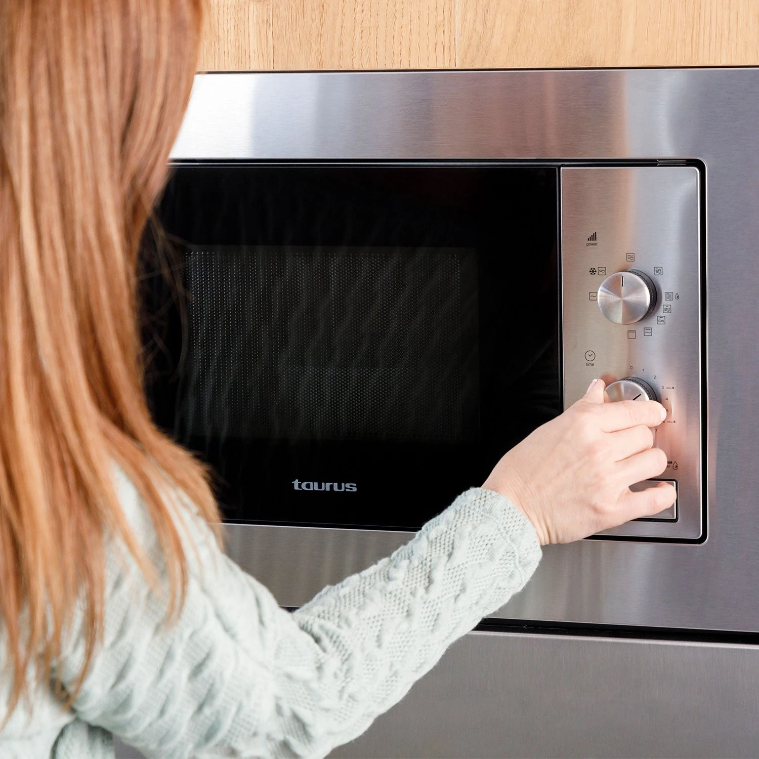 El microondas MO20IXM de Taurus es un microondas encastrable con 20L de capacidad, 5 niveles de potencia, 3 combinaciones de cocción+grill y varias funciones incorporadas. Cuenta con función descongelar y función grill. Con la función grill conseguirás unos gratinados perfectos tanto en carnes, pescados, pastas, etc. Para que los resultados se obtengan de manera más rápida, el microondas encastrable de Taurus tiene una potencia de 800W de potencia de microondas y 1000W de potencia de grill. Además, cuenta con un diseño moderno y de muy fácil uso, con dos selectores manuales giratorios y de gran visibilidad. El microondas encastrable MO20WHM incluye parrilla elevadora para el grill y plato giratorio de 245 mm de diámetro.