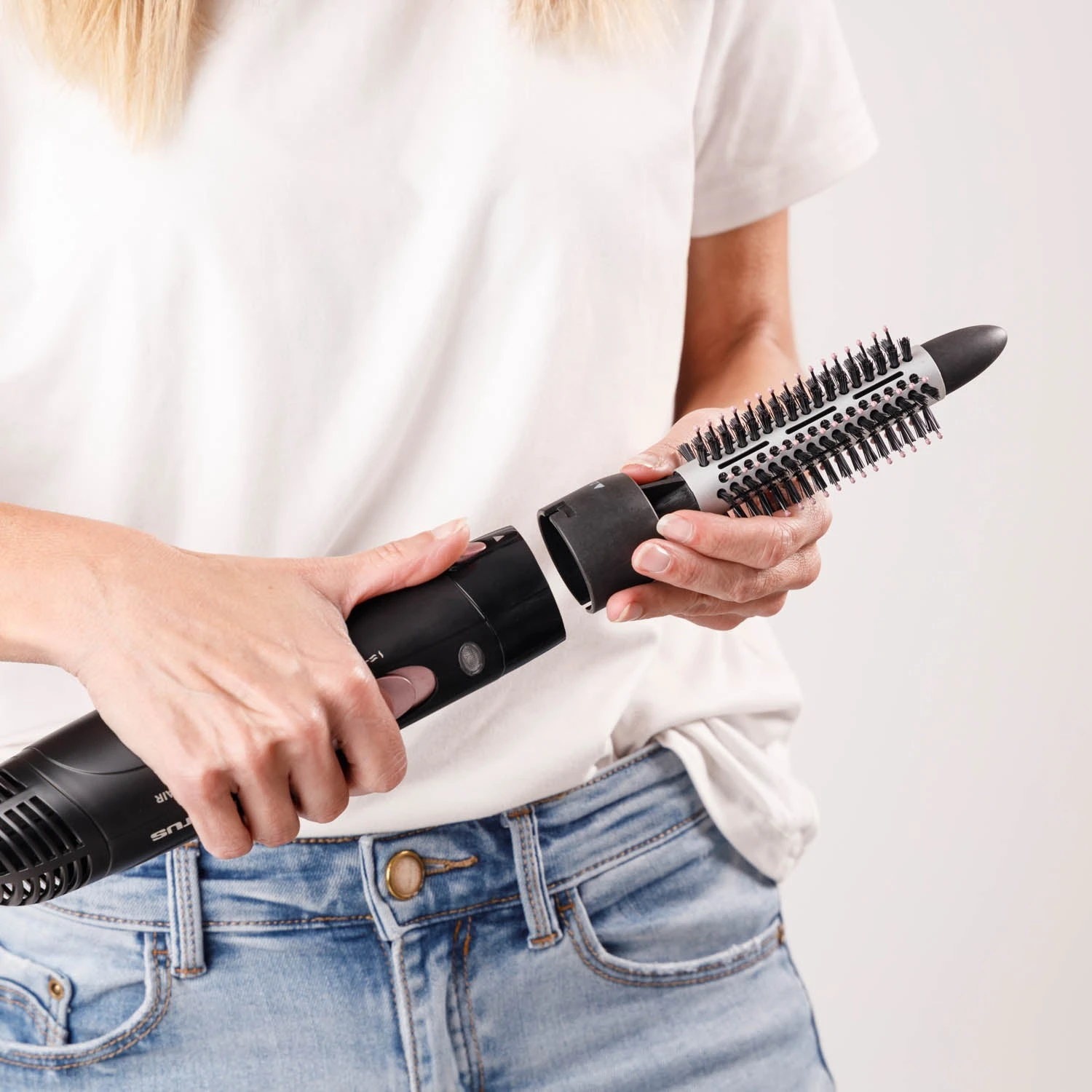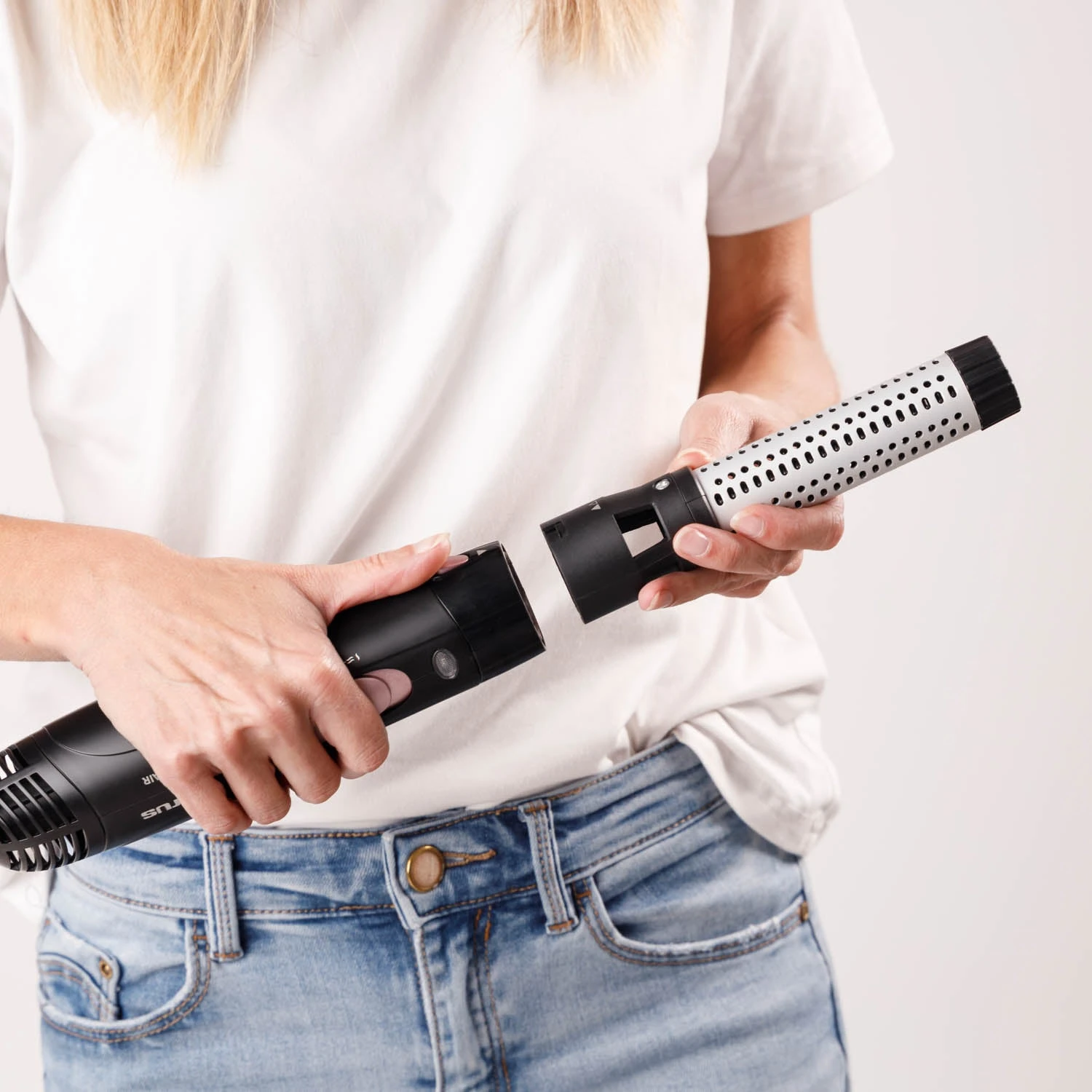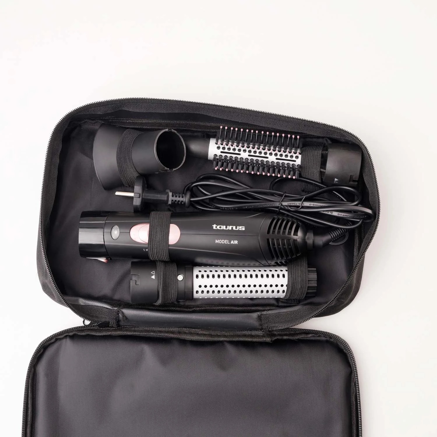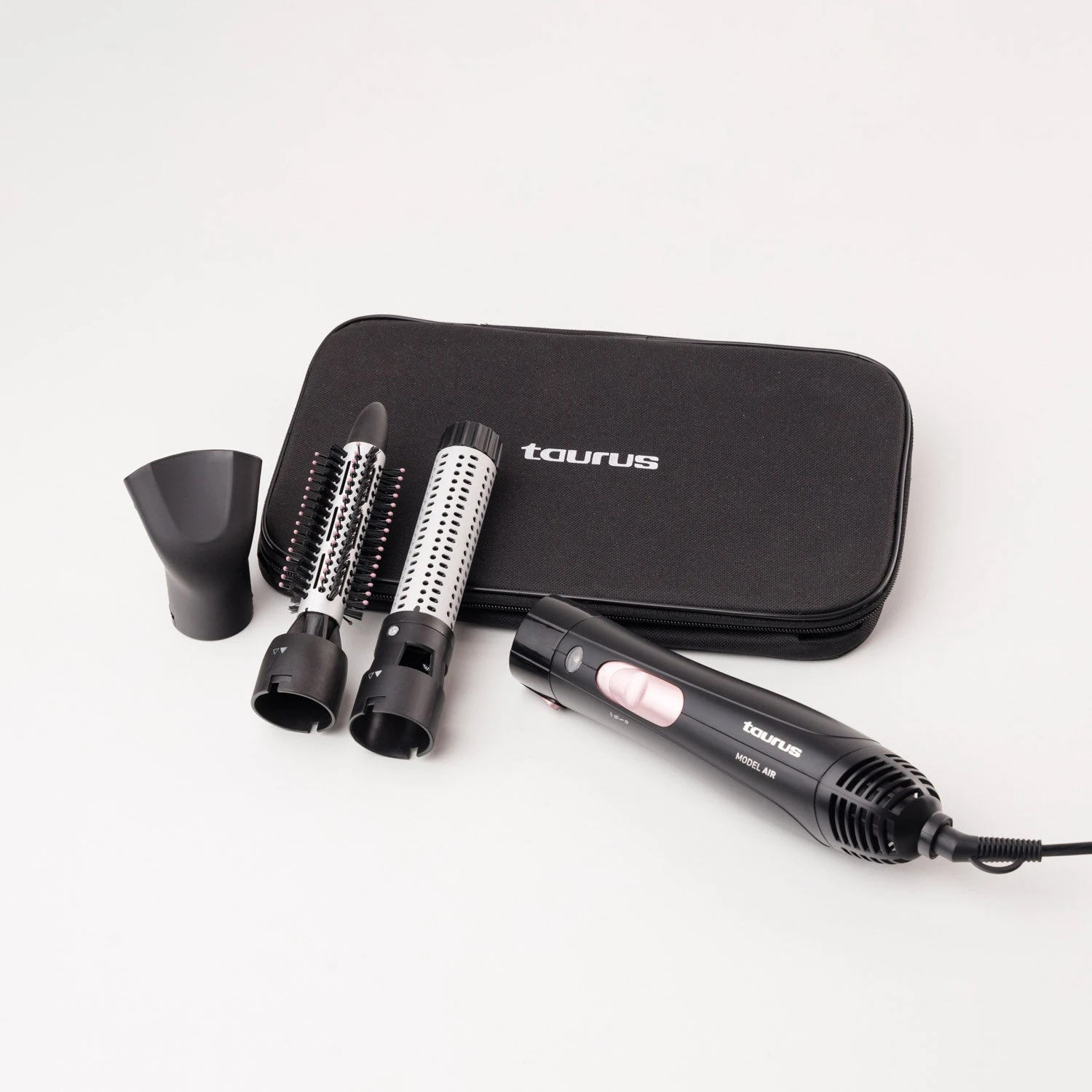 El moldeador de pelo Model Air de Taurus es la herramienta ideal para conseguir estilos profesionales en casa gracias a su potente motor de 1200 W, que asegura un secado rápido y eficiente. Incluye tres accesorios intercambiables: un concentrador para peinados precisos, un cepillo de cerdas combinadas que desenreda y aporta volumen, y un cepillo de cerdas retráctiles que permite crear rizos definidos o dar un extra de volumen.