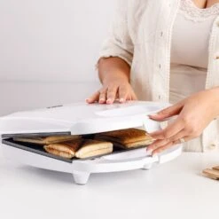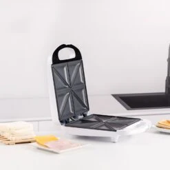 La sandwichera Mysandwich Family de Taurus ofrece 1200W de potencia y permite preparar 4 sándwiches triangulares, perfectamente sellados, gracias a sus placas de aluminio antiadherentes que distribuyen el calor de forma homogénea. Con diseño compacto, almacenaje vertical y cable integrado, ahorra espacio en la cocina. Incluye asa de toque frío, sistema de seguridad contra sobrecalentamiento y control automático de temperatura para un uso seguro. Fácil de limpiar y libre de PFOA y BPA, es ideal para preparar sándwiches rápidos y deliciosos con comodidad.