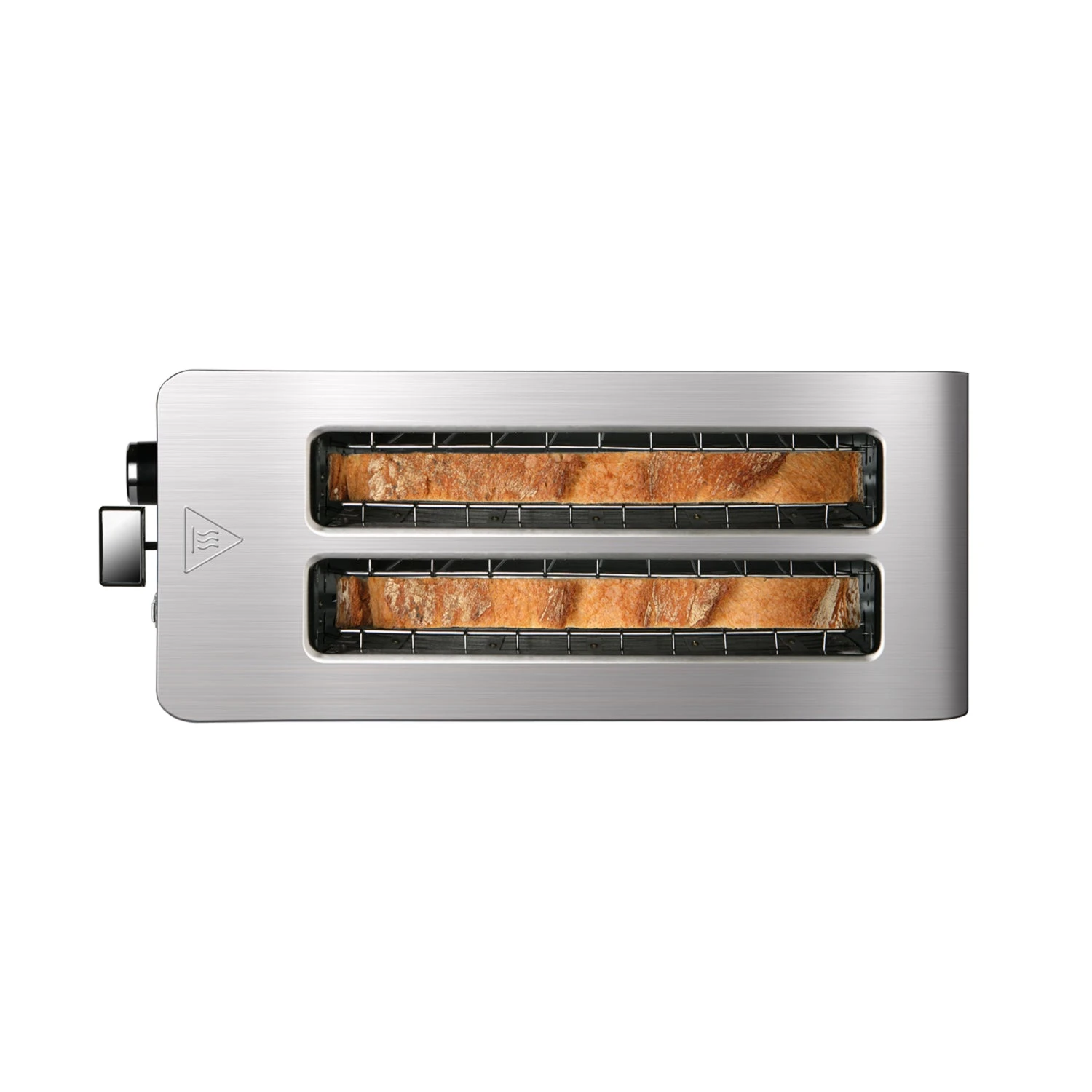 La tostadora de 1400W cuenta con 2 ranuras extra largas y ajustables para todo tipo de panes. Ofrece 5 niveles de tostado y 3 funciones: descongelar, recalentar y cancelar. Con sistema de auto centrado y elevación extra, garantiza un tostado uniforme y una extracción fácil. Su bandeja recogemigas extraíble facilita la limpieza, y los pies antideslizantes aportan seguridad. Con un elegante acabado en acero inoxidable, es práctica, eficiente y perfecta para disfrutar de desayunos deliciosos.