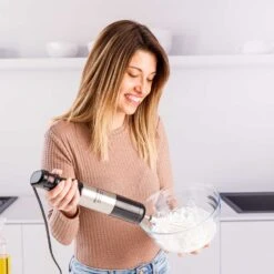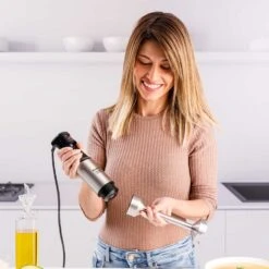 La batidora de mano Rocket 1500 Nero Plus Inox de Taurus combina 1500W de potencia, tecnología Stepless y cuchillas de acero inoxidable de alto rendimiento para batir, picar y emulsionar con precisión. Incluye picador de 500 ml, vaso medidor de 700 ml y emulsionador. Su diseño ergonómico con agarre soft-touch, campana antisalpicaduras y piezas aptas para lavavajillas garantizan comodidad y fácil limpieza. Fabricada con materiales libres de BPA, es perfecta para recetas saludables y versátiles.
