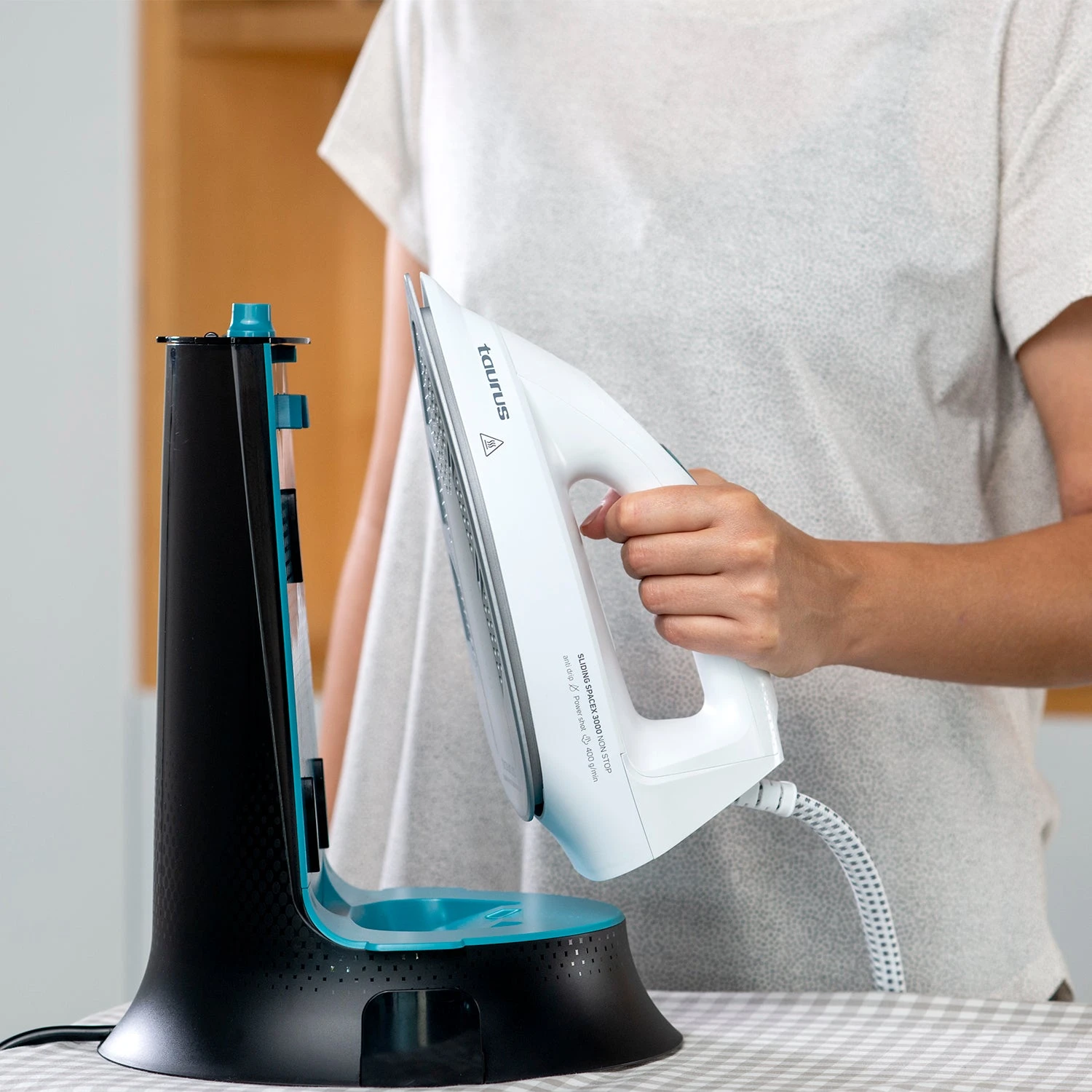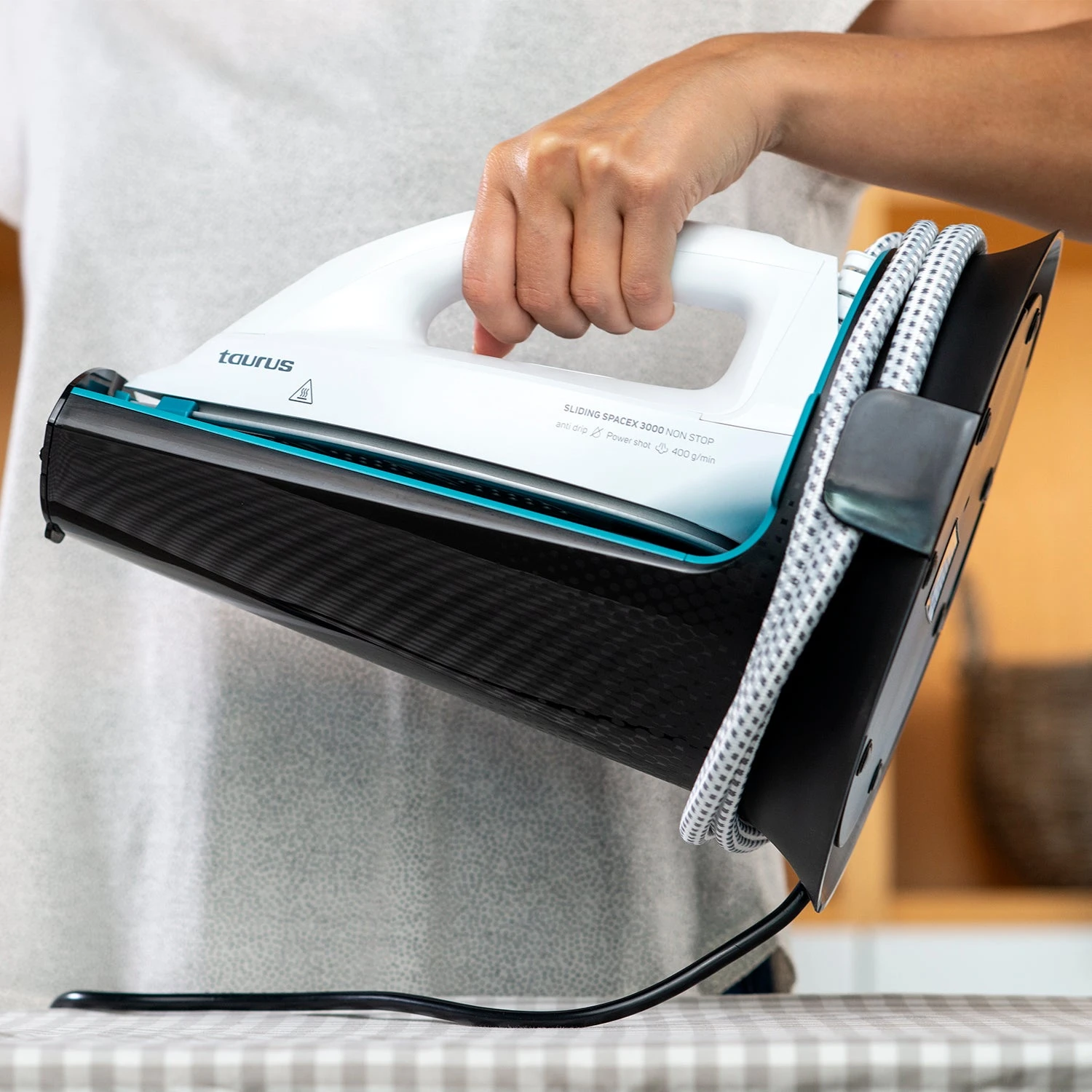 Este centro de planchado de 3000 W ofrece vapor continuo de 130 g/min y un super vapor de 400 g/min, logrando resultados equivalentes a un centro de 7 bar. Con sistema Non Stop, permite recargar agua sin interrupciones, mientras que sus modos ECO y MAX optimizan el consumo. Su suela de cerámica, planchado vertical y sistema de bloqueo patentado garantizan máxima comodidad y seguridad en cada uso. Ideal para un planchado rápido, eficiente y sin esfuerzo.